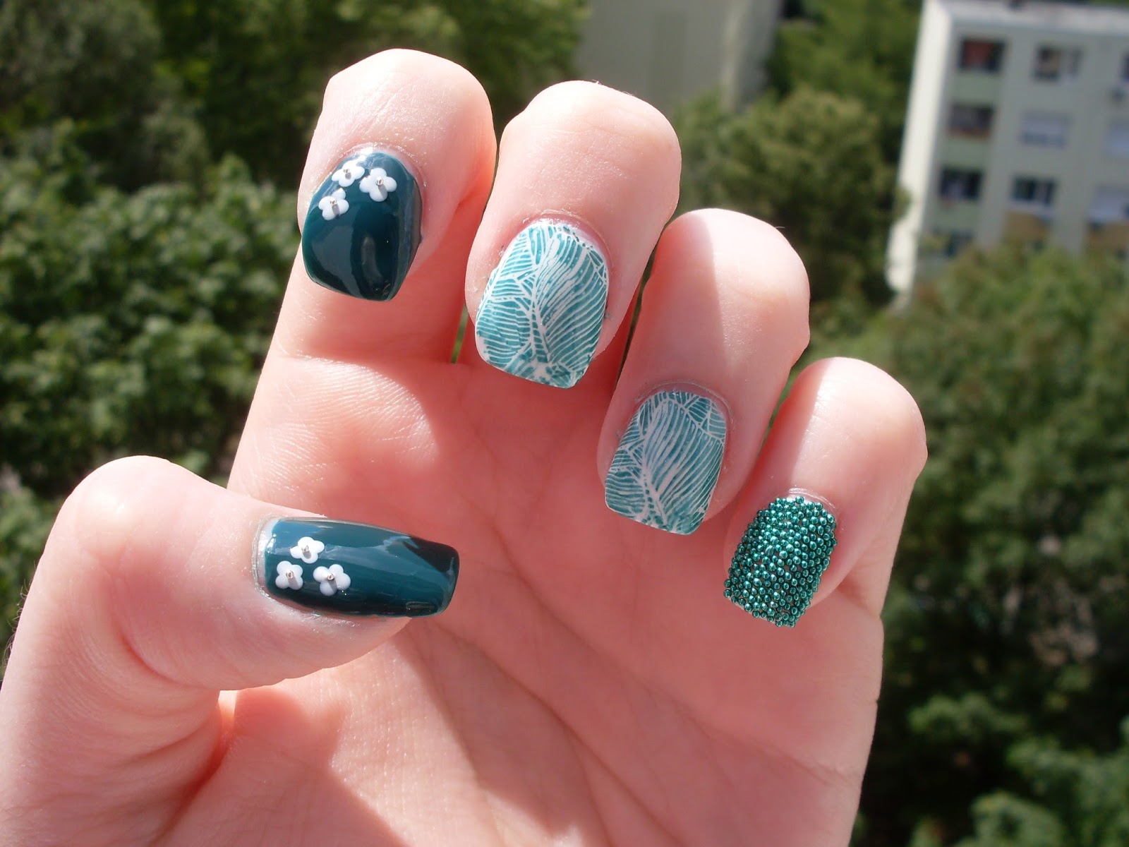 A fehér lakkom a végét járja, kicsit nyúlós lett az állaga, 3-3 réteg kellett belőle és sokat kellett várni a száradásra (már csak ezért sem volt kedvem lemosni és újrakezdeni :D). Egy régi, sötétzöld Essence lakkot választottam a mintához és ugyanez a szín ment a mutató- és hüvelykujjamra is. A kisujjamra pedig szintén fehér került, majd ebbe nyomkodtam bele sok-sok sötétzöld gyöngyöcskét is - jut eszembe, még kaviáros manikűr sem volt soha a blogon! Mivel a sötétzöld körmeimet túl csupasznak találtam, glitteres lakkokban pedig meglehetősen hiányt szenvedek, ezért rájuk pöttyintettem 3-3 minivirágocskát és a közepükbe 1-1 ezüstfehér gyöngyöcskét tettem.